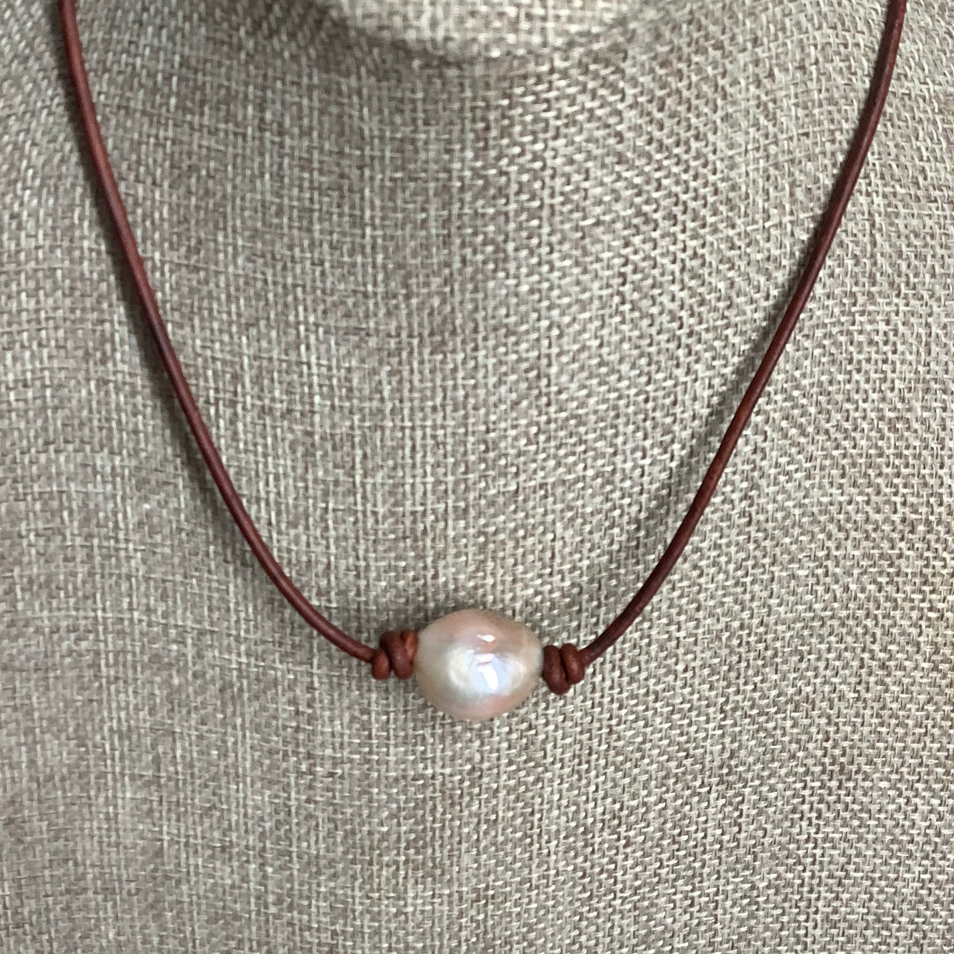 This oval 14x17 mm freshwater natural pearl necklace is a stunner. It is 18” on antique brown leather.