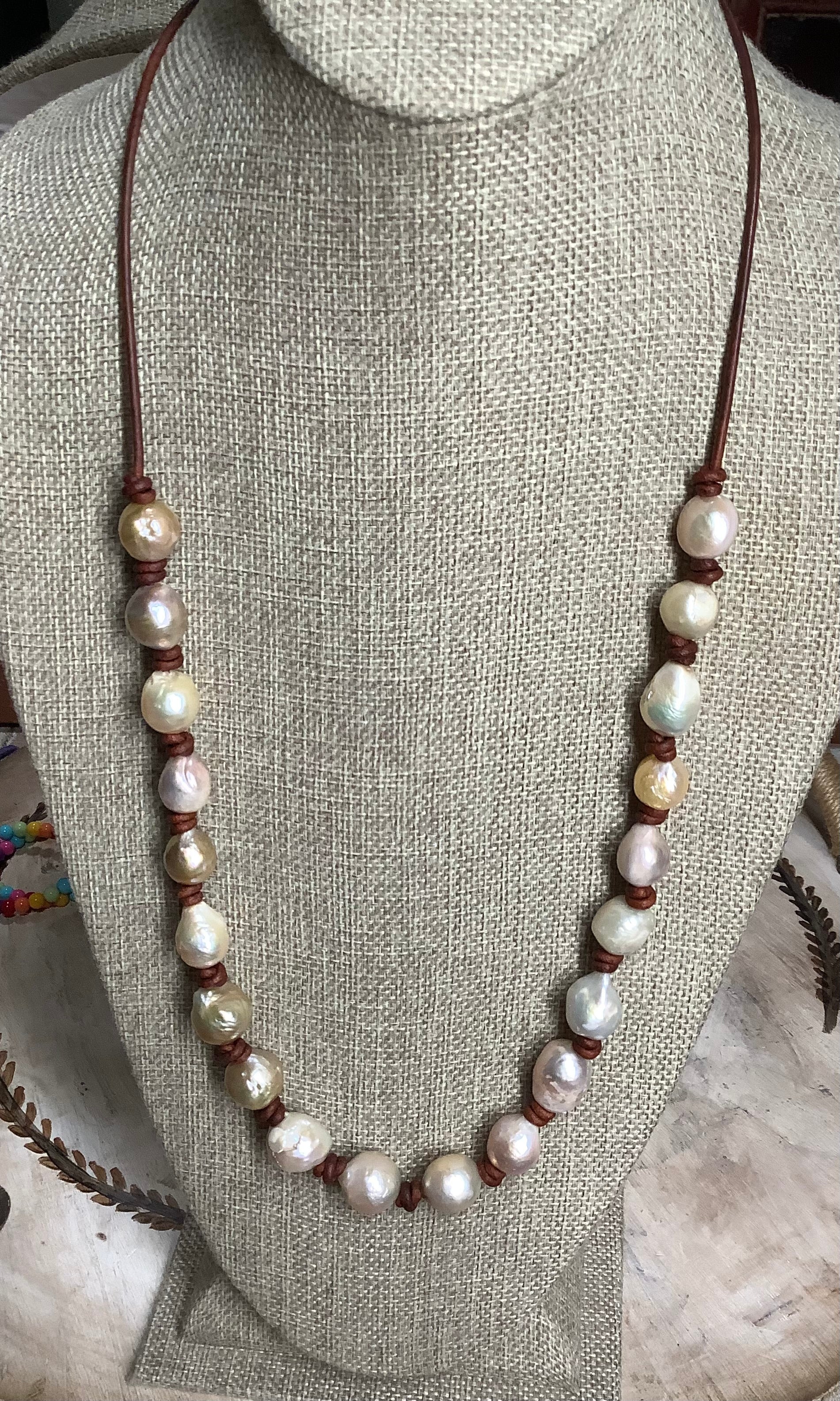 Expertly crafted with a 28" long antique brown leather, the Chelsea necklace features natural freshwater pearls that add a touch of elegance to any outfit. Made from high-quality materials, this necklace is perfect for both formal occasions and everyday wear. Upgrade your jewelry collection with the Chelsea necklace.